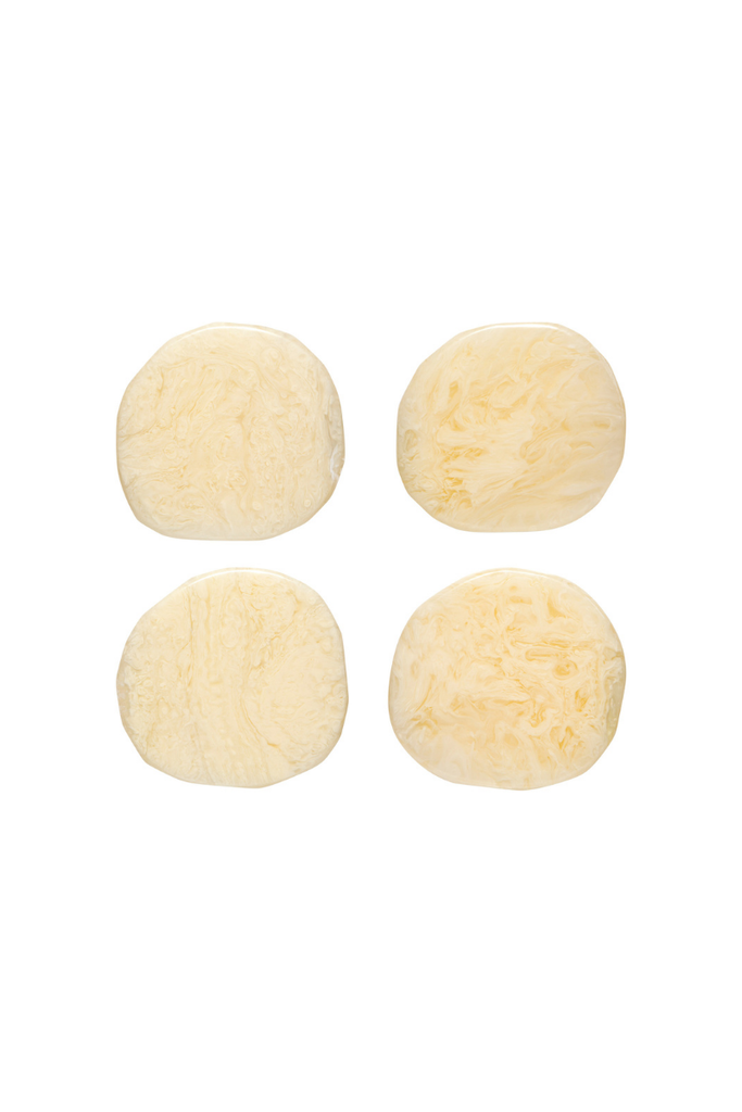 Glossy and organic, our resin coasters set fuse a classic pattern with a modern forms. A dappled Ivory pattern accents any space with understated elegance.