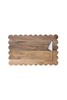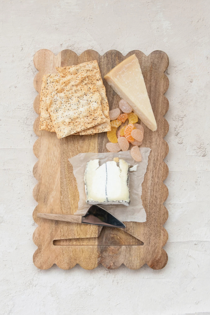 Elevate your entertaining with this set of two 16" x 10" mango wood boards, each featuring scalloped edges and a matching 6½" inlaid knife. The natural finish and sturdy construction make them perfect for serving cheeses, charcuterie, or appetizers at your next gathering.