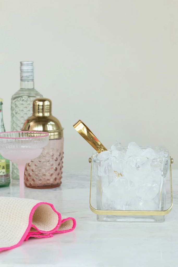 Elevate your entertaining with this set of two 24 oz textured glass ice buckets, each featuring a gold-finished handle and matching tongs. The square design and subtle texture add a touch of sophistication to any gathering.