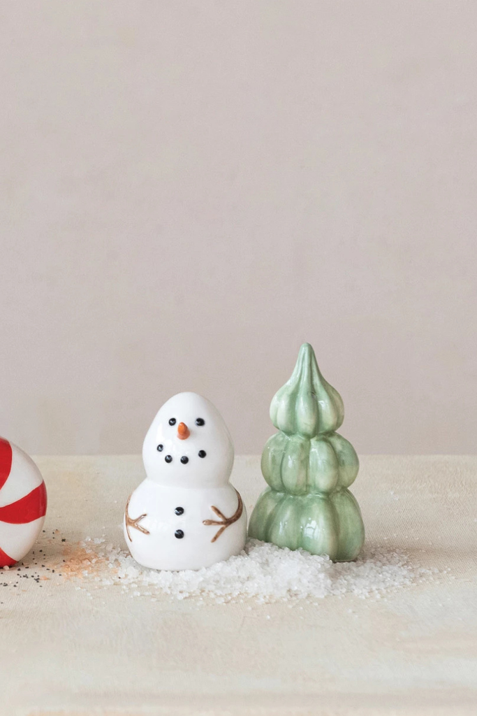 Bring festive charm to your table with this delightful set of stoneware salt and pepper shakers. The set includes a snowman and a Christmas tree, each thoughtfully designed with subtle detailing and a soft matte finish. These shakers are perfectly sized for holiday gatherings, cozy dinners, or as a whimsical gift for the season.
