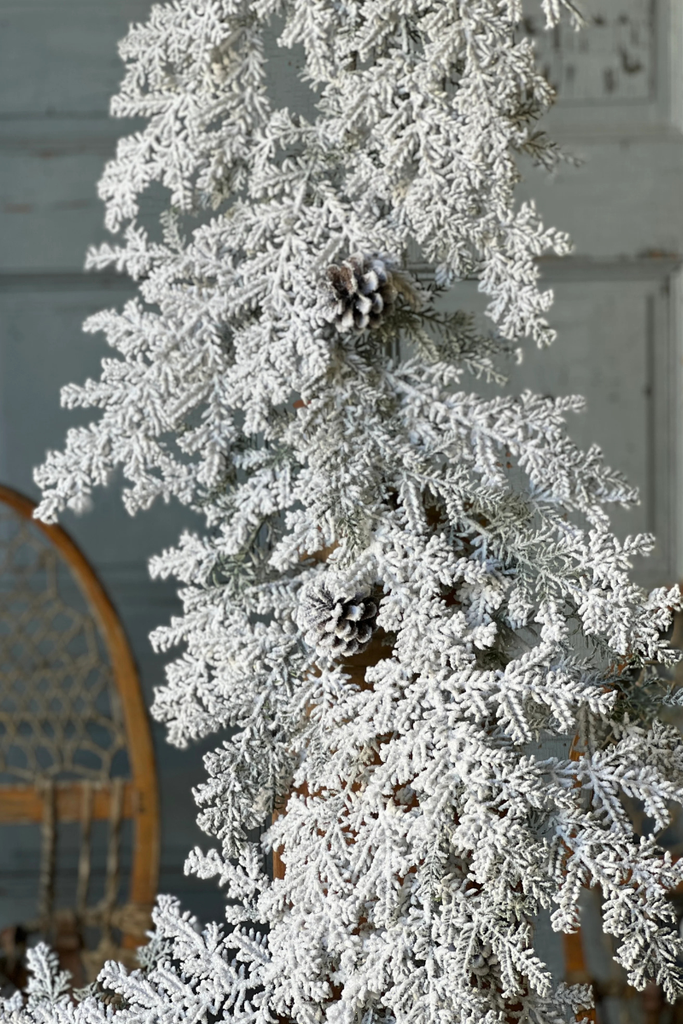 The Snowy Hemingway Fir provides a winter wonderland feel with is heavily flocked filigree like branches and peppering of natural pine cones.  A sheen of glitter adds an extra element of elegance to this already gorgeous collection.