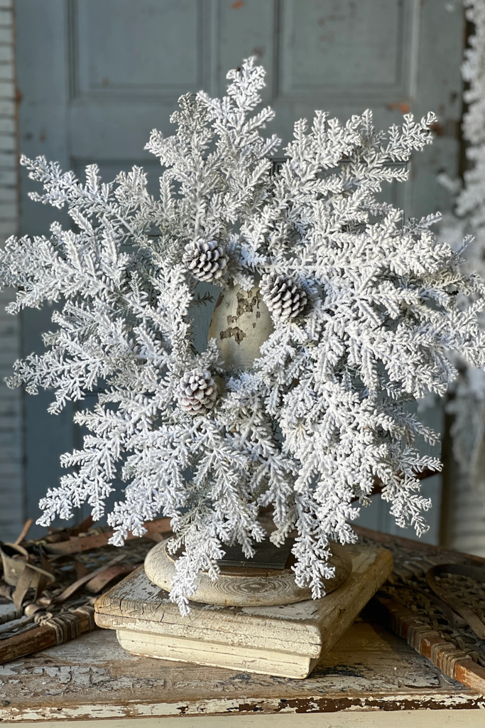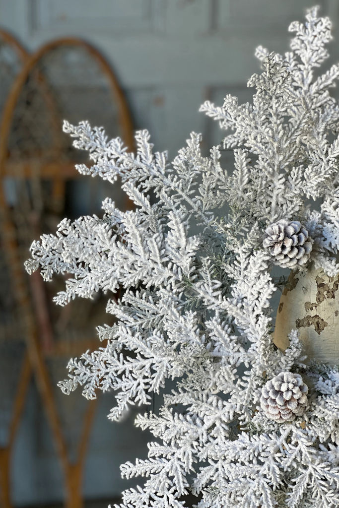 The Snowy Hemingway Fir provides a winter wonderland feel with is heavily flocked filigree like branches and peppering of natural pine cones. A sheen of glitter adds an extra element of elegance to this already gorgeous collection.