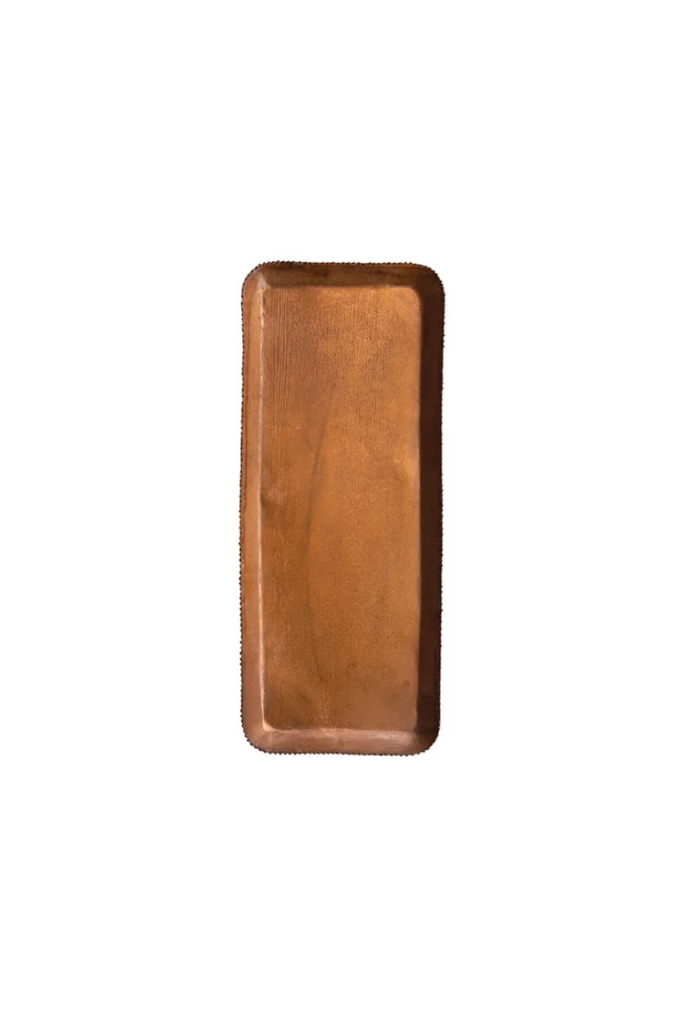 Elevate your entertaining with this large metal tray featuring a beaded edge and an antique copper finish. Crafted from durable iron, this tray offers both functionality and style. Its generous size makes it ideal for serving appetizers, displaying candles, or organizing items on your coffee table or vanity. The beaded edge adds a decorative detail, enhancing its overall aesthetic.