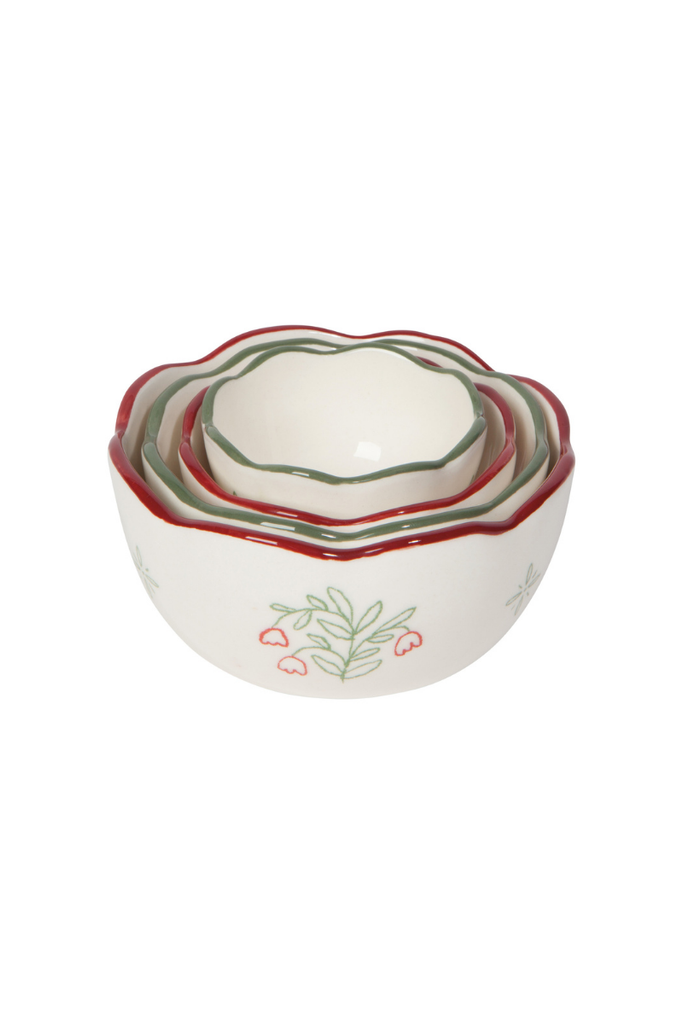 Delicate flowers in a quaint palette of sage green, wine red and bright white exude rustic farmhouse charm with this Camellia Stoneware nesting bowls set.
