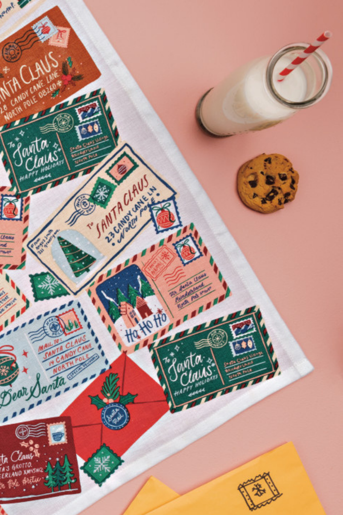 Add life and character to your kitchen with our fun and colorful printed Santa Mail woven cotton dishtowel. A perfect combination of form and function, this Christmas towel will make washing up less of a chore. Mailboxes overflow with messages destined for the snowy North Pole. Hopes and dreams are stamped and sealed for ‘Dear Santa’ to receive with love.