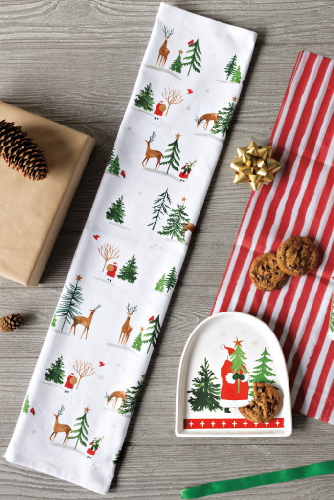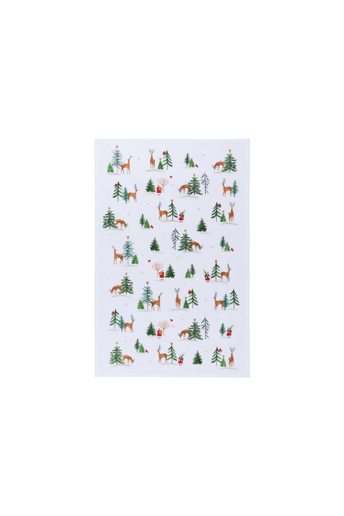 Add life and character to your kitchen with our fun and colorful printed and woven cotton dishtowel. A perfect combination of form and function, the Santa's Reindeer Christmas towel will make washing up less of a chore. Part of the Santa's Reindeer collection, this design gives us a glimpse of Santa and his beloved, steadfast team hiding amongst the trees.