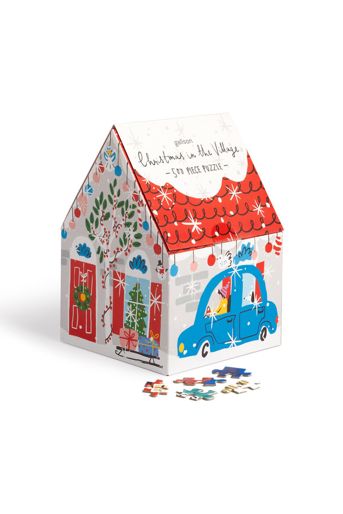 The Christmas in the Village 500 Piece House Puzzle from Galison features a charming town during the Christmas season. The puzzle is packaged in a house-shaped box making it the perfect holiday gift!
