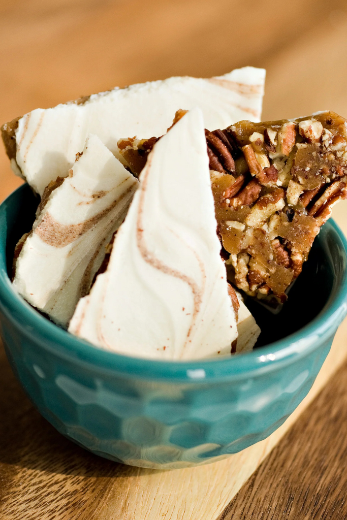 Layers of roasted pecans, buttery spiced toffee, topped with white chocolate and cinnamon swirl; in shareable 300g bag!