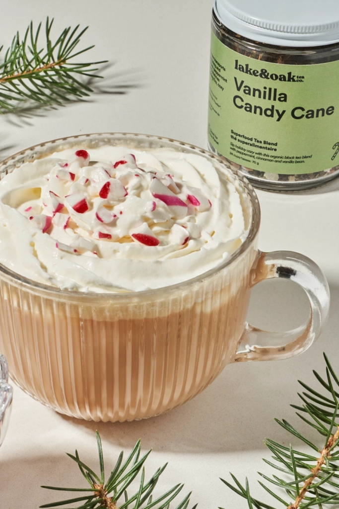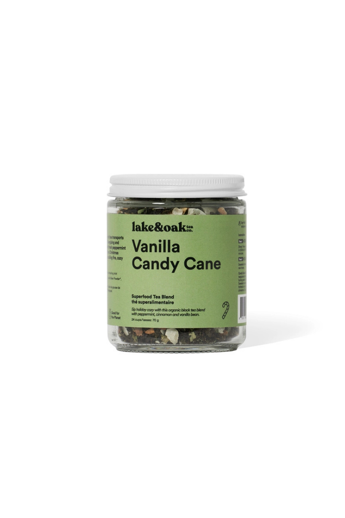 Creamy, cozy and minty-fresh, this joyful tea transports you to a dreamy winter wonderland. Energizing and antioxidant-rich black tea pairs up with fresh peppermint and vanilla bean for a superfood twist on Christmas candy cane. Pairs deliciously with a crackling fire, cozy socks and Hallmark holiday movies.