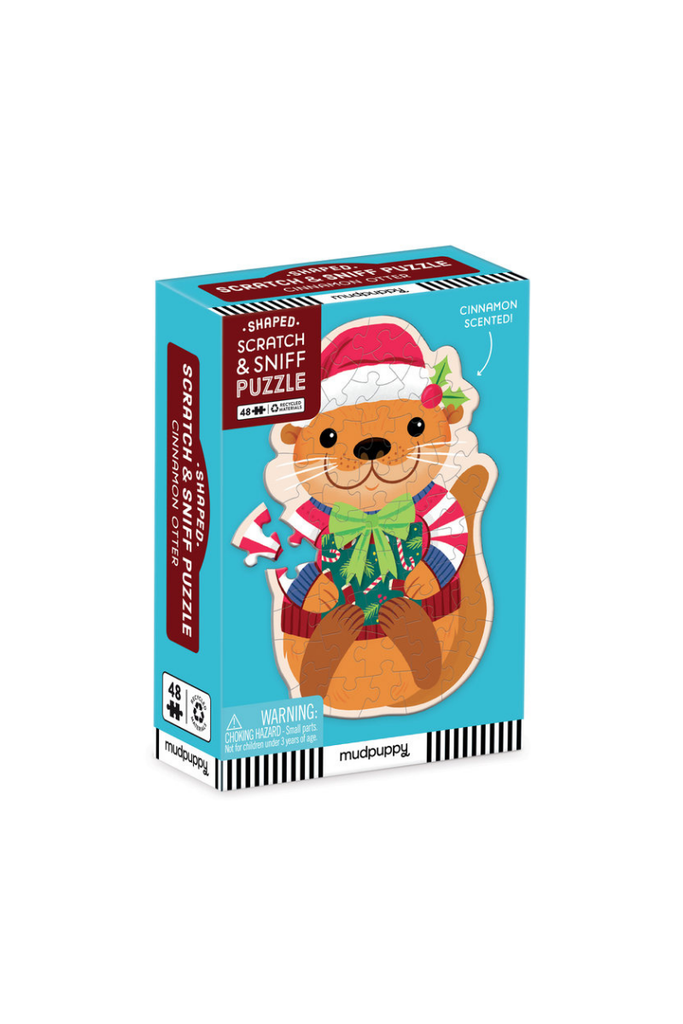 The Cinnamon Otter 48 Piece Scratch and Sniff Shaped Mini Puzzle from Mudpuppy features a colorful image of a festive otter holding a holiday present and is cinnamon scented. This mini puzzle is perfect for on the go travel fun and fits perfectly on airline tray tables.