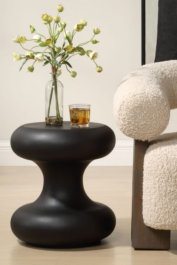With its matte black finish and unique bubbled hourglass silhouette, this man-made stone accent table offers a sophisticated blend of texture and form. Suitable for both indoor and outdoor use.