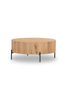 A slight cradle base of gunmetal-finished iron supports a beautifully rounded coffee table shaped from thick amber oak veneer. For a rich, one-of-a-kind look, black resin fills woods' natural cracks and graining. A subtle variance of resin placement and amount is to be expected, and reflective of materials' character-rich roots.
