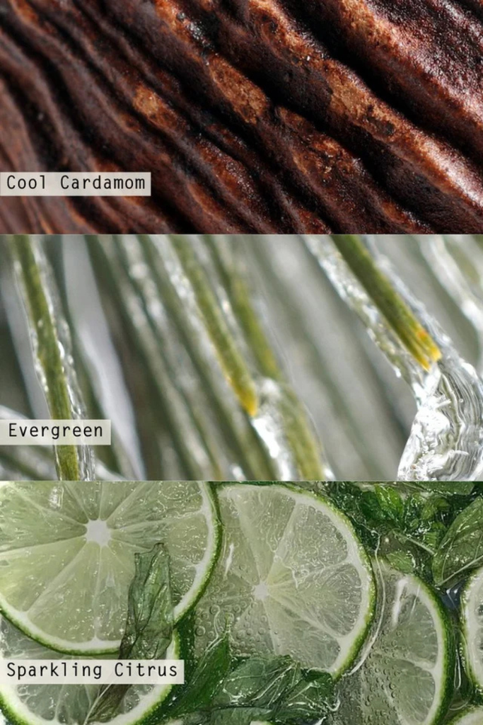 Grounded in cool cardamom with a heart of evergreen kissed with sparkling citrus.