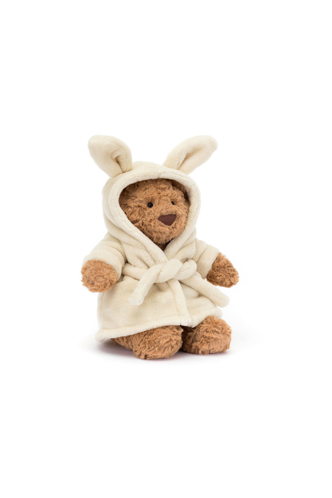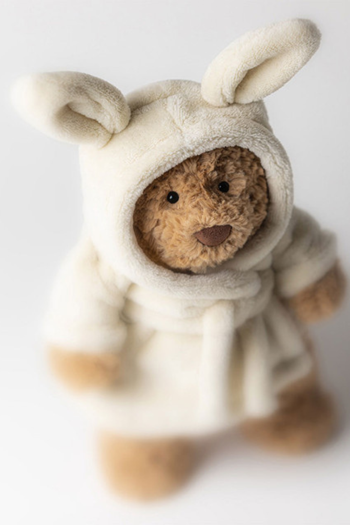 Technically, Bartholomew Bear is “getting ready for bed”. But in reality, with a robe this plush, he’s been in pre-sleep mode since 3pm. He takes lounging seriously: hot honey infusions (he swears by them), half-finished bedtime stories, and a commitment to the soft and gentle life. When he’s not powering down though, he’s a performer at heart. As well as this luxurious loungewear, Bartholomew loves to dress up. From pumpkins to personalized jumpers, there’s a look for every occasion. Which one takes your fancy?