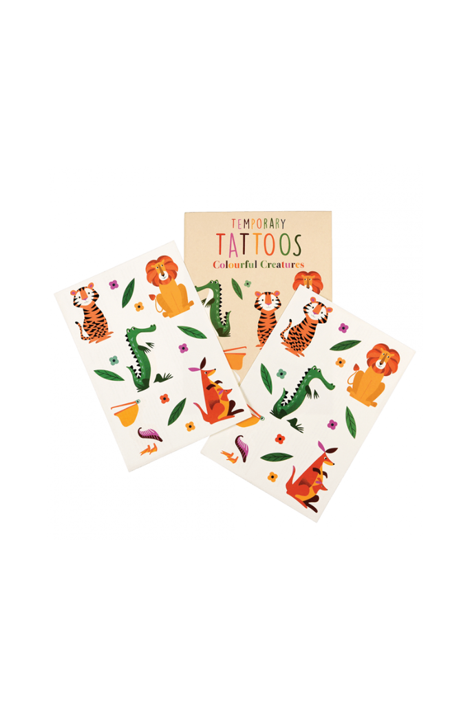 A sweet party bag or stocking filler - Colourful Creatures temporary animal tattoos. Two sheets included, each with 5 characters and flowers to cut out and apply. Assorted sizes.