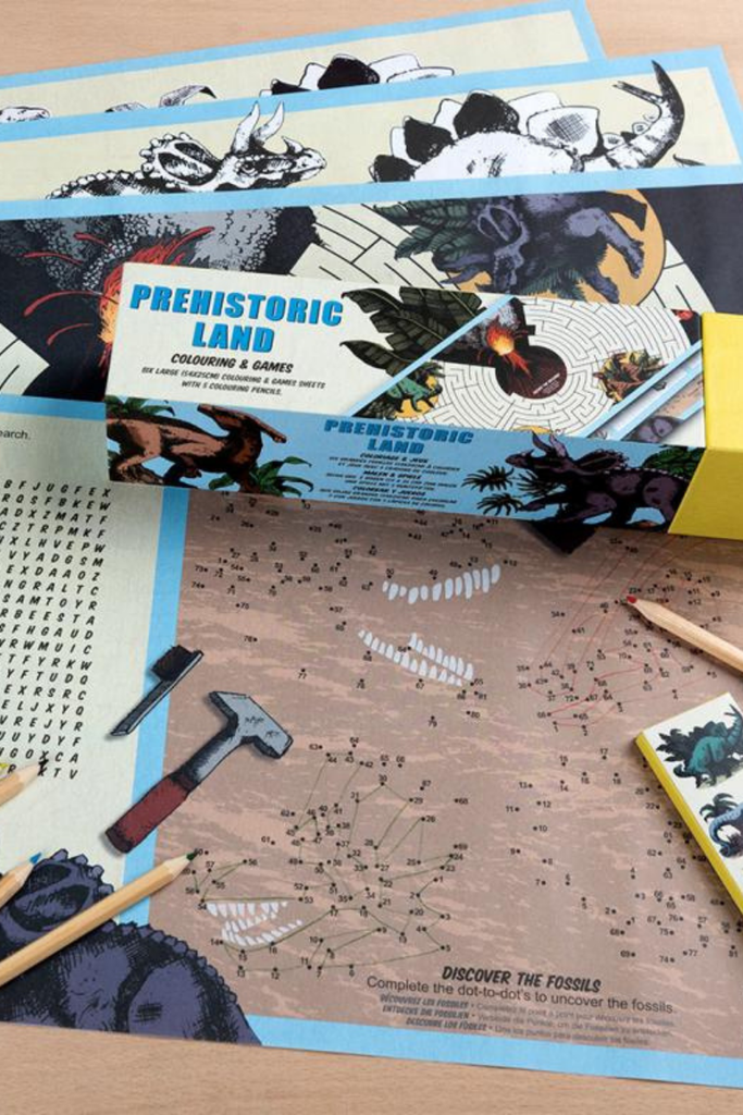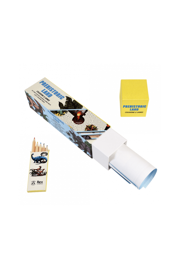 Keep dino-mad children busy and creative with this colouring and games set featuring dinosaur scenes and illustrations from our Prehistoric Land range.