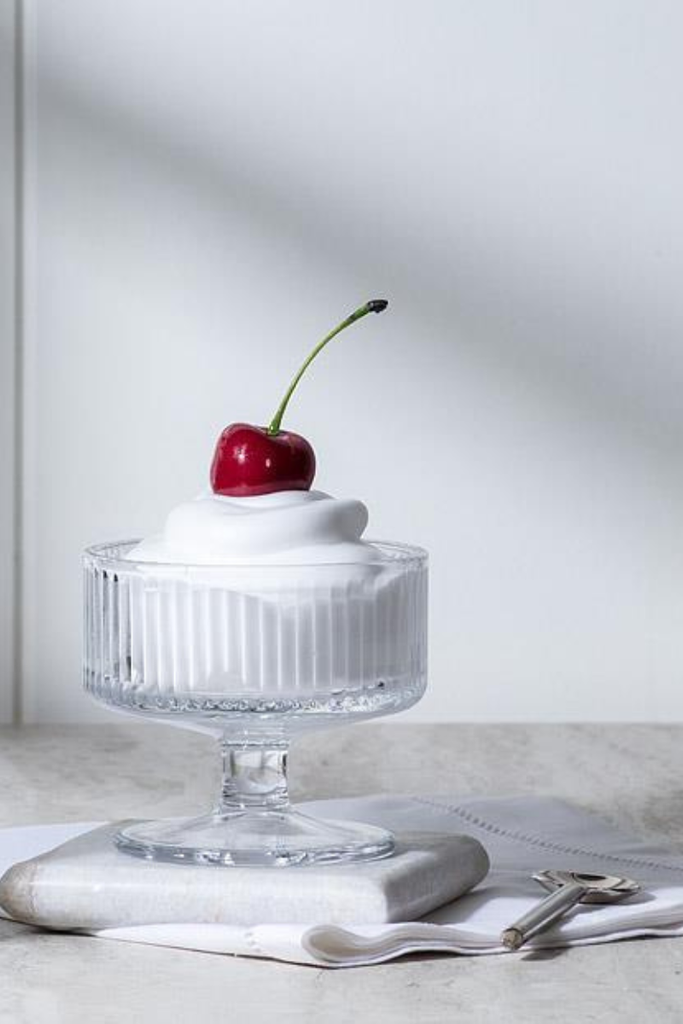 This glass pedestal bowl catches the light – and the eye – with its tight optic design. Ideal for candies, jewellery, or nothing at all, it delivers a refined touch to dressers, tables, and vanities alike.